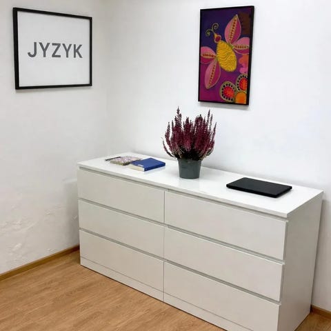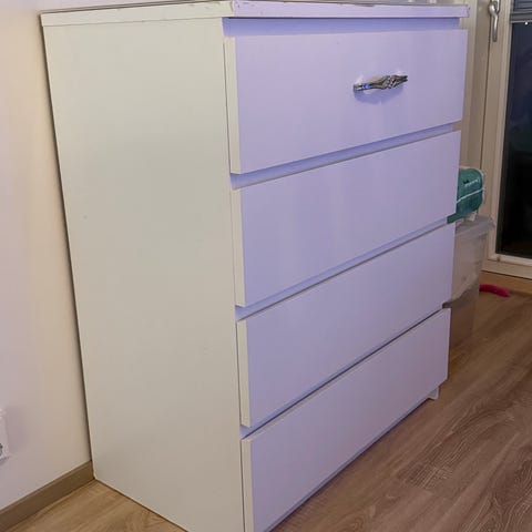 Ikean malm valkoinen lipasto kolmella laatikolla.