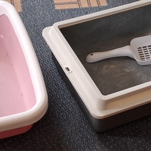 Korkeareunainen kissahiekkalaatikko ja lapio. Uusi