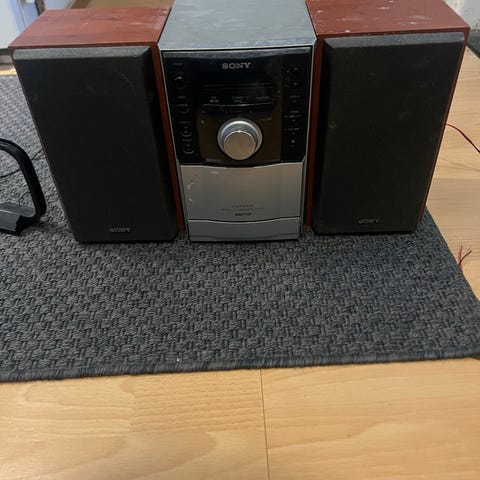 Sony stereosarja, jossa keskusyksikkö ja kaksi erillistä kaiutinta. Keskusyksikössä etupaneelissa ohjauspainikkeet ja levyasema. Kaiuttimet ovat erilliset ja koteloidut, etupuolella kangassuoja ja sivuilla puunsävyinen viimeistely. Sopii esimerkiksi musiikin kuunteluun ja radion tai muun äänilähteen toistamiseen kotikäytössä. DVD soitin samassa. Ei kaukosäädintä. Kuvissa muutama kuluma.