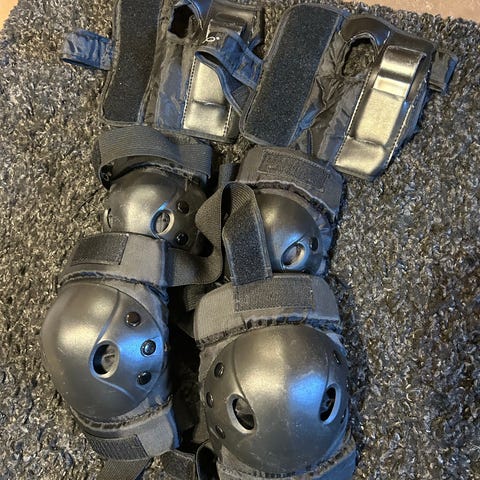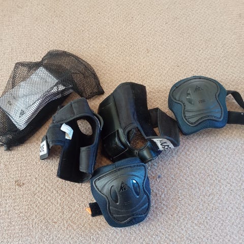 Esim. Rullaluisteluun, skuuttailuun tai skeittailuun tarkoitettu suojavarustesetti. Settiin kuuluu polvisuojat, kyynärsuojat ja rannesuojat. Väri on musta, sisäpuolella punaista pehmustetta. Suojissa on kovat kuoriosat ja tarranauhakiinnitykset, jotka mahdollistavat koon säätämisen. Soveltuu rullaluisteluun ja muuhun vastaavaan rulla- tai potkulautailuun, jossa tarvitaan perussuojausta polville, kyynärpäille ja ranteille. Koko on pieni, ehkä 1-3 luokkalaiselle voisi mennä - saa sovittaa ennen ostopäätöstä