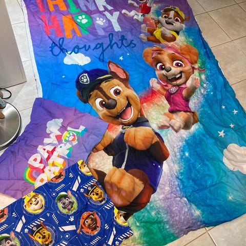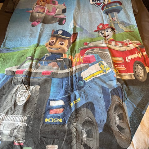 Pienten lasten lakanat, huom koot. Tyynyliina noin 36x40 cm ja pussilakana n. 105x125cm. Tyynyliinassa sama kuva molemmin puolin, pussilakanassa kuva ja taustakangas (näkyy kuvassa tyynyliinan alla).