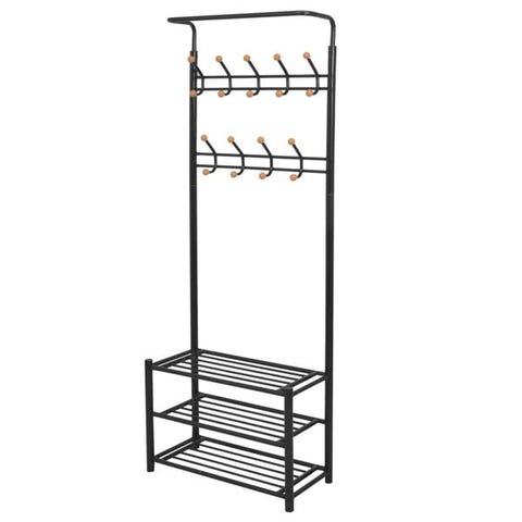 IKEA Hemnes naulakko ja kenkäteline. Naulakossa on ylhäällä hylly, vaatetanko ja useita nuppeja takkien ja asusteiden ripustamiseen. Kenkätelineessä on taso istumista tai tavaroiden laskemista varten sekä useita ritilätasoja kenkien säilytykseen. Väri on valkoinen, naulakossa on lisäksi tummat metalliosat. Sopii eteiseen tai muuhun tilaan vaatteiden ja kenkien säilytykseen.(vain nouto)