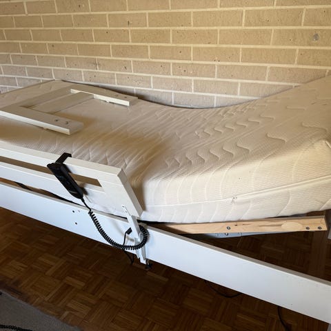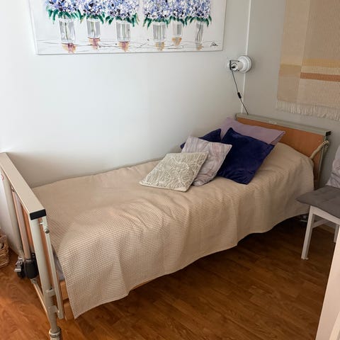 Elbur merkkinen sähkökäyttöinen hoitosänky, jossa metallirunko ja pyökkipuiset päädyt ja laidat. Sängyssä on säätötoiminnot pääpuolen ja jalkopään nostoon sekä korkeudensäätö 40 cm - 80 cm, jotka ohjataan johdollisella käsiohjaimella. Pohjassa on puiset sälepohjat ja runko on pyörien päällä helpompaa siirtelyä varten. Soveltuu esimerkiksi kotihoitoon tai liikuntarajoitteisen henkilön vuoteeksi tai seniorisängyksi. Muovitettu patja ja sisältyy mukaan. Sänky ei ole ollut hoitokäytössä vaan seniorisänkynä helpottamassa sängystä nousua.