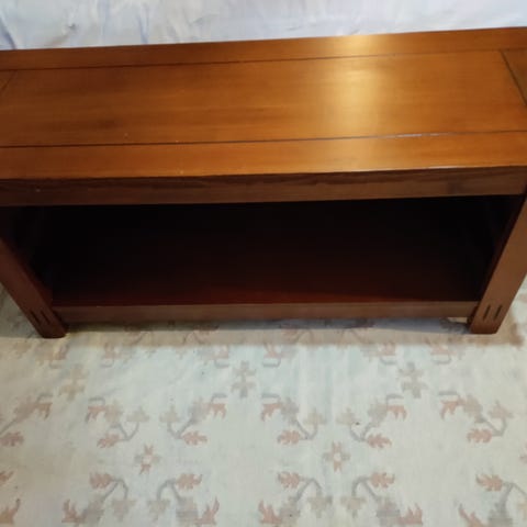 Puinen TV-taso pyörillä. Pinnassa pari jälkeä jotka näkyvät kuvissa.