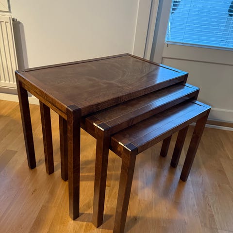 Myydään sarjapöytä jossa kolme erikokoista pöytää. Koivua. Kulumaa pinnoissa, kuitenkin ehjät ja tukevat. Myydään settinä, hinta kaikista pöydistä yhteensä.