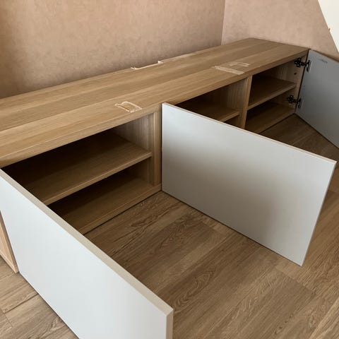 Edullisesti IKEA Bestå tv-taso. Muuten siisti mutta huomiona vasemmassa reunassa pieni reikä kalustelevyssä. Voisi kitata ja maalata mutta menettelee kun peitetty mustalla huopatassulla.