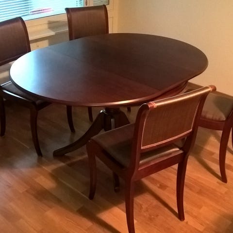 Kalusteet on hankittu 1978. Kalusteiden kunto on todella hyvät. Vain yhden tuolin istuinpäällisen kulma on hieman kulunut käytössä.