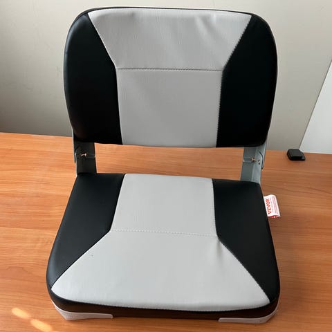 Flipper 760 veneen sisätilan penkit jossa valkoinen verhoilu ja siniset raidat keskiosassa. Toinen penkki koostuu istuinosasta ja erillisestä selkänojasta, ja toisessa penkissä on metalliset kiinnikeosat sivuilla selkänojan tukemista varten ja penkin saa makuuasentoon.