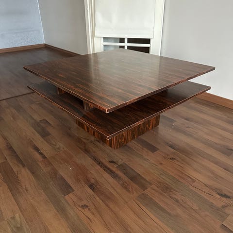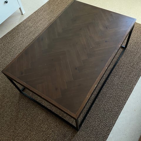 Myydään stailauskäytössä ollut pieni puinen sohvapöytä. Pöytä on kauttaaltaan vaaleaa puuta.