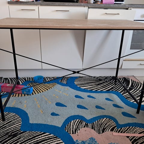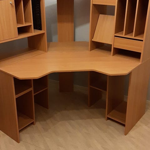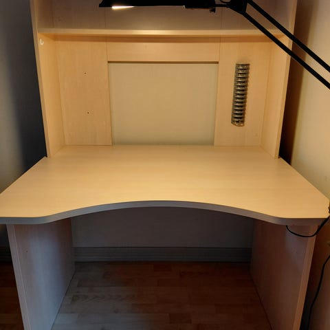 Työpöytä myynnissä, ehjä, perusilmeeltään siisti, käytönjälkiä, jotka hyvällä pesulla saattanee lähteä.