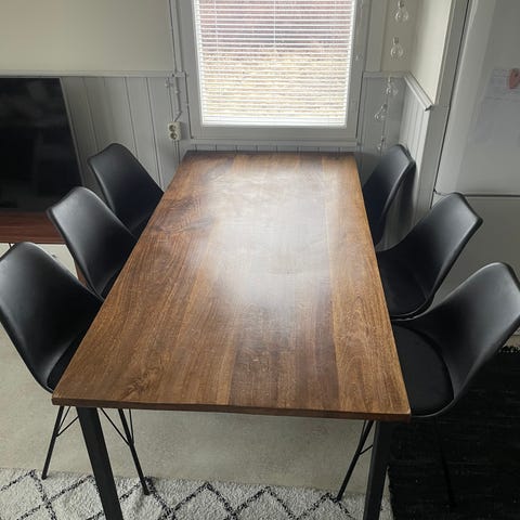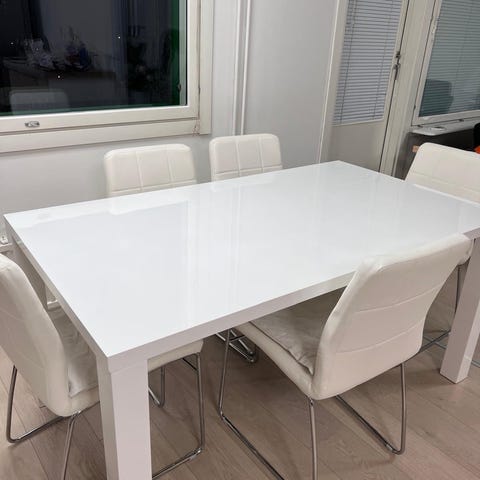 Myydään kaunis ruokaryhmä. Settiin sisältyy korkeakiiltovalkoinen tukevajalkainen pöytä ja kuusi metallirunkoista tuolia. Tuoleissa on tekonahkainen musta verhoilu. Pöydän pinnassa näkyy pientä käytön jälkeä, muutamassa tuolissa verhoilussa on kulumaa. Pöydän koko: leveys 90 cm, pituus 180 cm ja korkeus 75,5 cm.