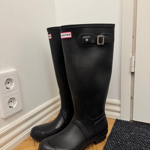 Hunter kumisaappaat, koko 36. Lyhytvartinen malli, väri musta. Soveltuvat arkeen ja ulkoiluun sateisella säällä.