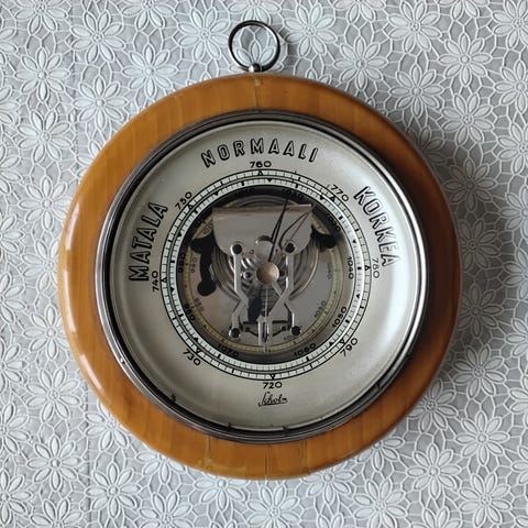 Vanha puinen seinäbarometri lämpömittarilla. Laitteessa on pyöreä barometrin näyttö ja sen yläpuolella pystysuuntainen lämpömittari. Runko on tummaksi sävytettyä, koristeellisesti kaiverrettua puuta, jossa on lehväaiheinen koristelu. Barometri näyttää ilmanpaineen ja lämpömittari lämpötilan. Sopii sisäkäyttöön esimerkiksi eteiseen, olohuoneeseen tai mökille ilmanpaineen ja lämpötilan seurantaan. Korkeus noin 46 cm. Kuvan mukaisessa kunnossa. Vain NOUTO