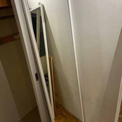 Lasiset liukuovet. Alaosa harmaa lasi ja yläosa kirkas peili. Harmaa osa alhaalta mitattuna 86 cm. Mukana kaikki tarpeellinen mitä asennukseen tarvitsee, kiskot ja ohjain ylös. Mitta mikä ilmoitettu on aukon mitta missä ovet ovat olleet paikoillaan.