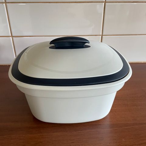 Tupperware muovinen säilytysastia. Ovaalinmuotoinen ruskea astia, jossa valkoinen kansi ja erillinen valkoinen ritiläosa. Soveltuu elintarvikkeiden säilytykseen ja esimerkiksi jääkaappi- tai pakastinkäyttöön tuotteen ohjeiden mukaan. Materiaali on kestävää muovia ja astia on tarkoitettu keittiön yleiseen säilytyskäyttöön.