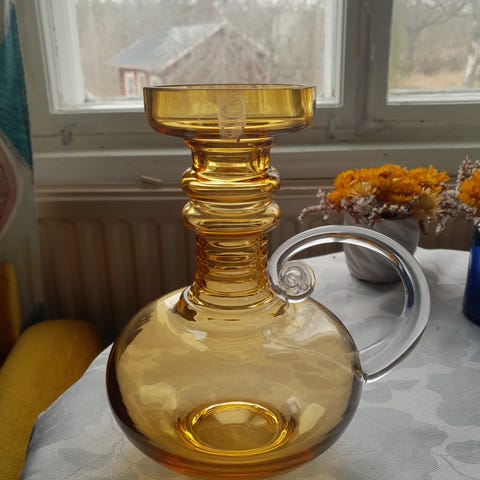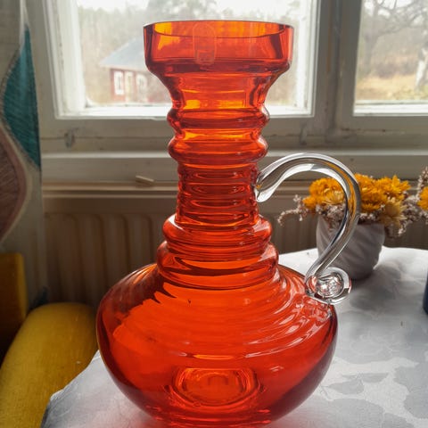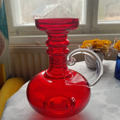 Tamara Aladinin suunnittelema vihreä Kleopatra maljakko, tuotenumero 1502, Riihimäen lasille.