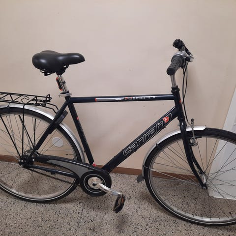 Hyvää ja hieno keltainen pyörä ja ruskea nahkainen satula.