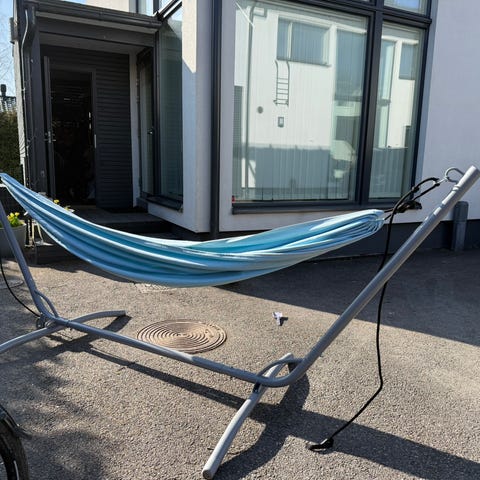 Riippumatto telineellä. Valkoinen kangasriippumatto, jossa puiset levikepuut päädyissä.