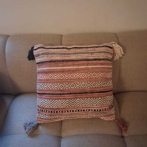 Myydään kaksi Askosta hankittua jämäkkää sisustustyynyä, koko 50 cm X 50 cm. Räsymatto-kuosi toisella puolella, sopivat hyvin vaikka terassille tai mökille. Kulmissa tupsut. Hinta yhteensä 15 €.