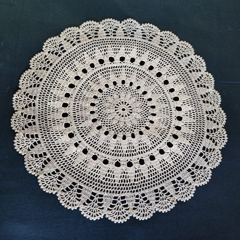 Uudenveroinen, käsin virkattu pyöreä pöytäliina.