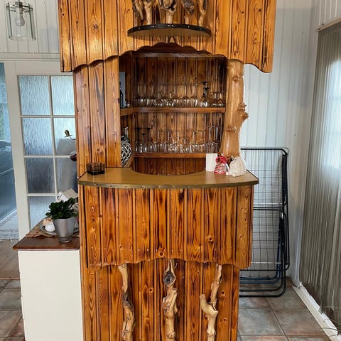 Baaritiski led valolla, 4 jakkaraa ja seinälle tuleva vitriini