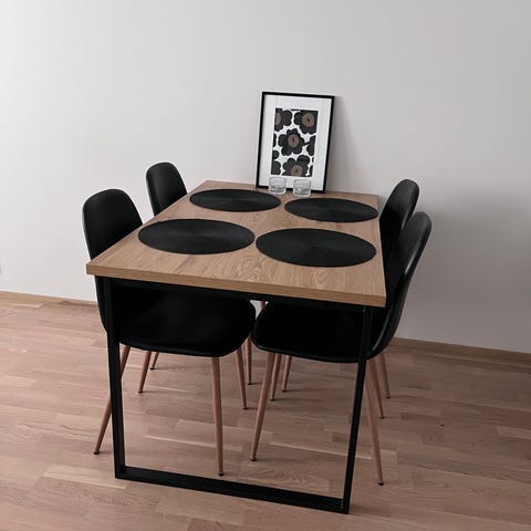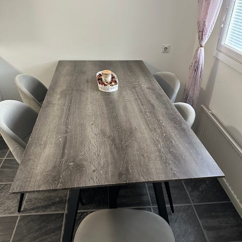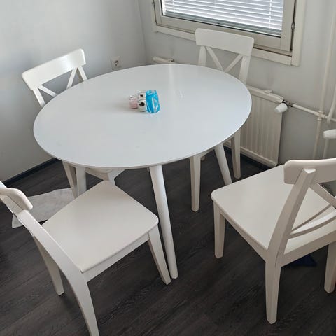 Maskusta ostettu ruokailuryhmä. Jokaisessa tuolissa edellisen kissan raapimajälkiä. Pöytä yleisesti hyvässä kunnossa, mutta kuvissa näkyy muutama kulumakohta.