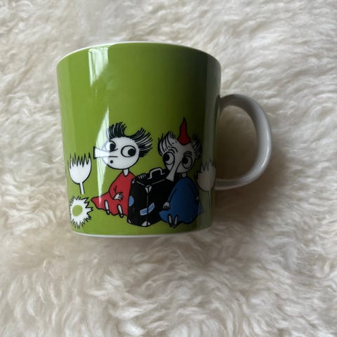 Tarrallinen ja käyttämätön Arabia Tiuhti ja Viuhti Muumimuki (Thingumy & Bob, jossa vihreä pohjaväri ja Muumi-hahmoihin perustuva kuvitus. Muki on valmistettu kestävästä posliinista ja siinä on korvalla varustettu perinteinen mukimuoto.Kuviot kiertävät mukin ympäri, ja pohjassa on painettuna sarjan nimi sekä valmistajan tiedot.