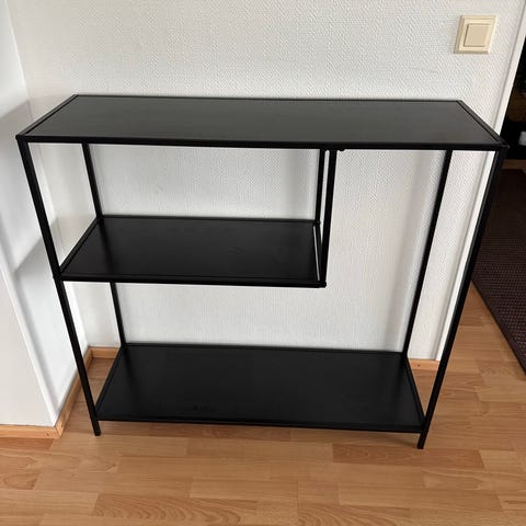 Hyväkuntoinen seinää vasten nojaava hyllykkö. Korkeus 175 cm ja leveys 31 cm