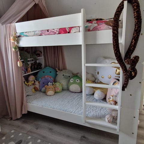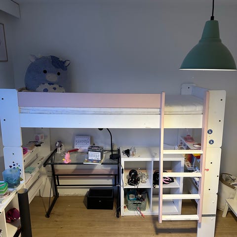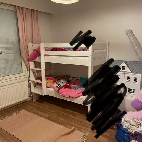 Täyspuinen tumma kerrossänky tikkailla. Ohessa kuva valkoisesta vastaavastasta sängystä, josta näkee kokonaisuuden. Tällä hetkellä sängyt erillään, joista toisesta kuva ohessa. Sänkyjä voidaan siis käyttää kerrossänkynä tai kahtena erillisenä sänkynä. Mitat: Leveys, korkeus 75 ja pituus 208 cm.