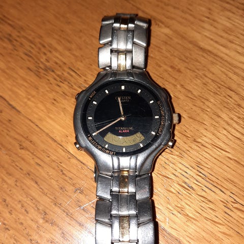 Citizen rannekello metallirannekkeella. Kellossa on pyöreä kuori ja tumma kellotaulu, jossa on analoginen näyttö sekä päivämääränäyttö.