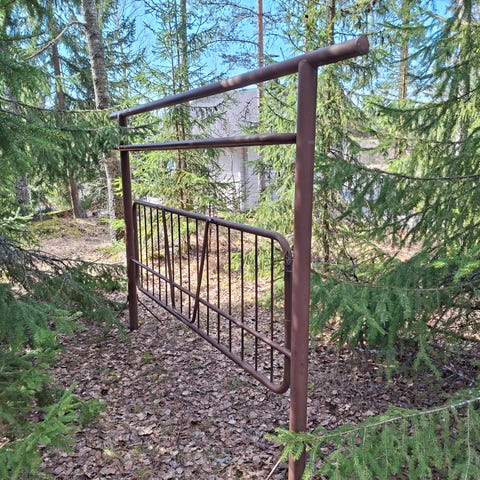 Hyväkuntoinen teline seuraavalle. Yläosa ainakin irtoaa helposti kuljetusta varten.