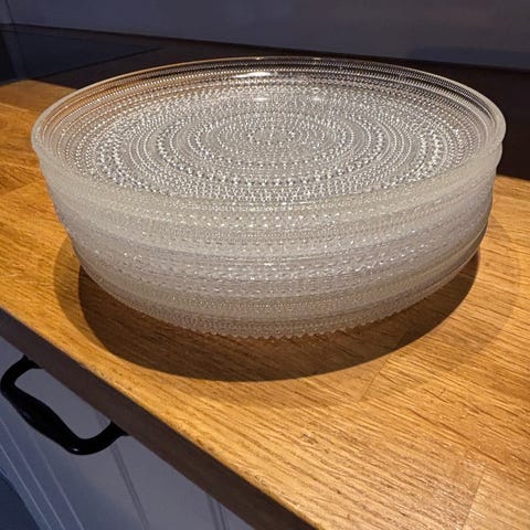 Myydään Iittala Kastehelmi leipälautaset. Hyväkuntoisia. Näitä on 4kpl sammaleenvihreitä, ja 2kpl kirkasta. 5€ kpl. Voidaan postittaa ostajan kustantaessa laatikon (2€ Puuilo), sekä postikulut 6.90€
