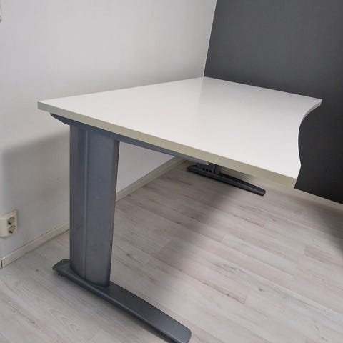 Omavalmisteinen työpöytä, ikean laatikot reunoilla. Pöytälevy on penslattua 26mm mäntylevyä. Pöydän alla on kaapeleita varten kouru. Molemmissa lipastoissa on kaapelikanavat.