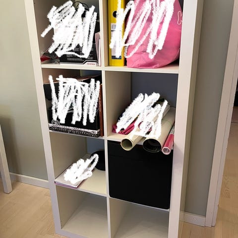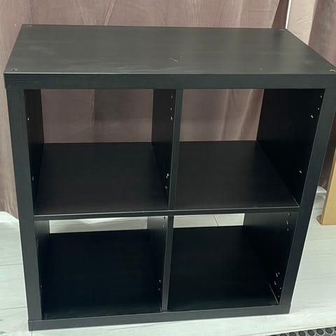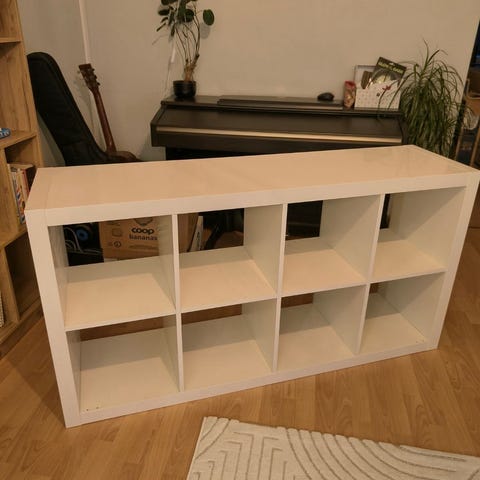 Hyväkuntoinen IKEA Kallax muutamilla lisäosilla, millä hyllyjä voi jakaa puoliksi.