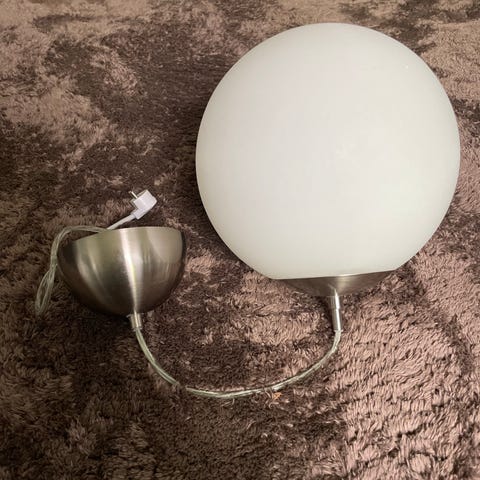 Valaisinpallo on himmeää kevyttä muovia, jonka halkaisija noin 20 cm. Metallinen ripustusputki on noin 30cm.