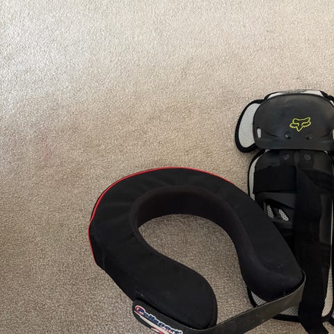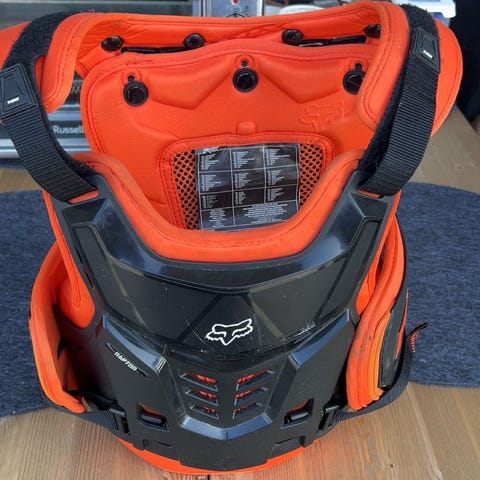 Fox rintapanssari. Väriltään harmaa ja musta, edessä Fox-logo. Suunniteltu suojaamaan rintaa ja selkää esimerkiksi motocrossissa tai muussa offroad-ajossa.