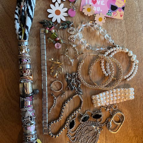 Kokoelma erilaisia koruja, mukaan lukien korvakoruja ja rannekoruja. Korut ovat eri tyylejä ja värejä, ja niissä on erilaisia koristeita ja riipuksia.