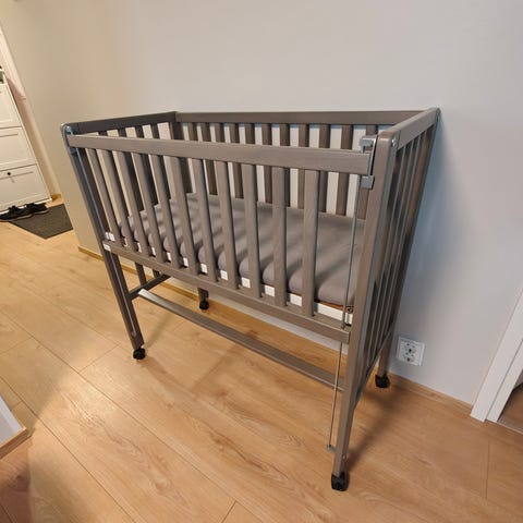 Kätevä sivuvaunusänky josta irtoaa yksi reuna ja korkeutta voi säätää. Näin sängyn saa halutessa vanhempien sängyn viereen kiinni. Kunto muuten erinomainen mutta maalissa pieniä kulumia. Saisi varmaan harmaalla tussilla piiloon. Patjassa käytetty aina suojaa.