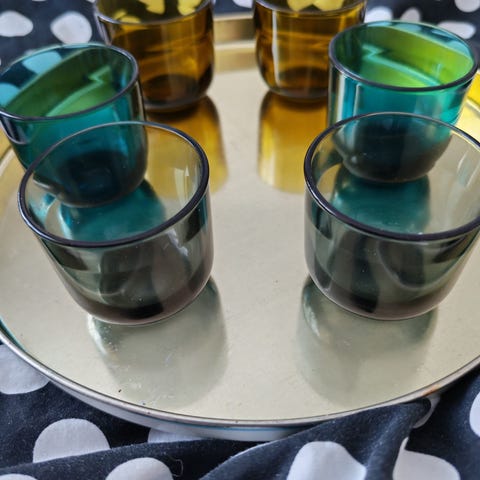 Timo Sarpanevan Iittalalle suunnittelema Pisaranrengas-sarjan snapsilasi ja Helminauha-sarjan sokerikko.