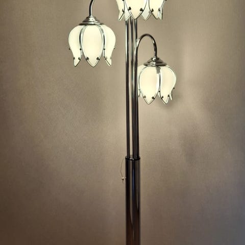 Pölyinen Kissankello lattiavalaisin. Valon himmennin ei toimi vaan sammutus vaatii johdon irrottamisen pistorasiasta. Johdossa naarmuja.