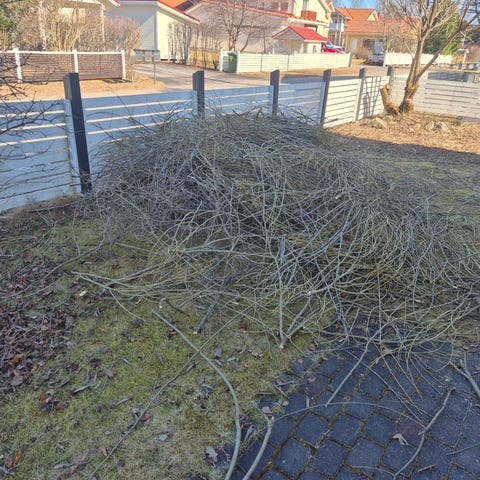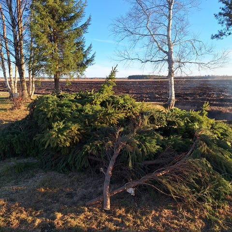 Havuja on ha:n peräkärryllinen. Eilen kaadetusta nuoresta tuuheasta pihakuusesta. Kärryllä pääsee viereen.
