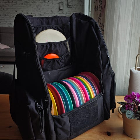Dynamic Discs Trooper frisbeegolfreppu musta. Reppu on suunniteltu frisbeegolfkiekkojen kuljettamiseen. Pääosastossa on tilaa useille kiekoille, ja etupuolella on avoin lokero helpottamaan kiekkojen ottamista. Repussa on vetoketjullisia taskuja pienille tarvikkeille, kuten markkereille, käsipyyhkeelle tai puhelimelle. Olkahihnat ja selkäosa on pehmustettu kantomukavuuden parantamiseksi. Sopii frisbeegolfin harrastajalle kierroksille ja harjoitteluun.