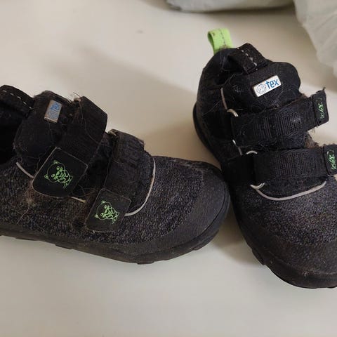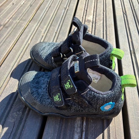Avoin sandaalimalli, jossa nauhakiinnitys edessä ja tarrakiinnitys kantapäässä. Pohjassa kuvioitu kumipohja, joka antaa pitoa.