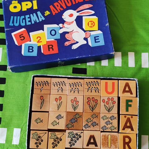 1970-luvun puinen palikkapeli pikkulapsille. Puinen laatikko ja puiset värilliset erimuotoiset palikat.