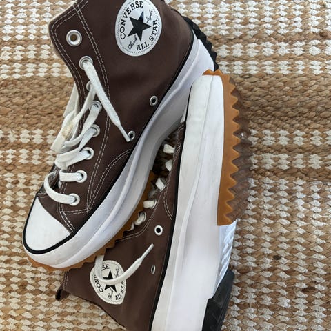 Käytetyt Converse run star hike korkeavartiset mustat kengät. Koko 40. Molempien kenkien kielet hieman kuluneet, mutta kengät solmittuna ei niitä oikeastaan näe. Päkiöiden taitoskohdissa kulumaa myös molemmissa kengissä. Tämän hetkiset narut huonossa kunnossa, joten voin ne jättää pois paketista, jos niin haluaa. Myynnissä myös muualla.