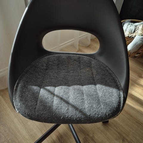 Jyskin työtuoli ASPERUP. Kissatalous ja sen mukaisia käytön jälkiä näkyvissä.
