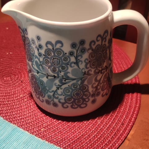 Arabia kannu valkoinen punaisin pilkuin. Keraaminen kannu, jossa kaatonokka ja korvakahva. Soveltuu esimerkiksi maidon, veden tai mehujen tarjoiluun. Valkoinen pohjaväri ja tasaisesti sijoitetut punaiset pilkut koristeena. Pohjassa Arabia-leima ja merkintä Finland.