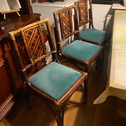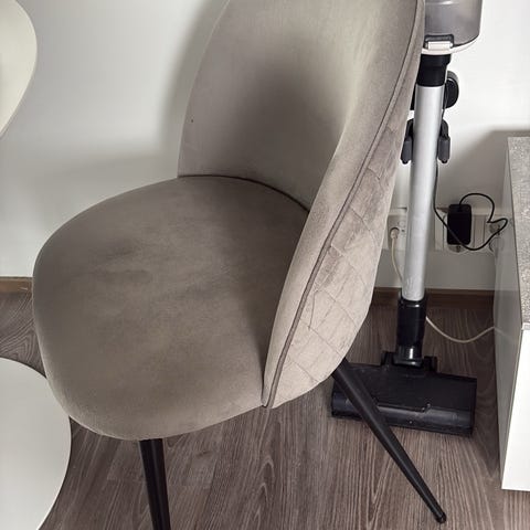 Ruokapöydän tuolit, yhteensä 4 kappaletta. Tuoleissa on beige, hieman nukkapintainen verhoilu ja mustat metallijalat. Selkänoja on pyöristetty ja istuinosa kevyesti muotoiltu. Sopivat esimerkiksi ruokapöydän tuoleiksi tai lisäistuimiksi oleskelutilaan. Hinta yhteensä kaikista neljästä tuolista, ehdota hintaa! Varattu 10.4 asti.