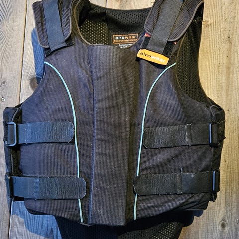 Airowear Outlyne ratsastajan turvaliivi, koko Y3. Väri musta turkooseilla tehosteraidoilla. Liivissä on useita tarrakiinnitteisiä säätöhihnoja sivuilla ja olkapäillä istuvuuden säätöön. Sisäpinta on verkkokangasta, joka parantaa ilmanvaihtoa. Liivi on sertifioitu standardin EN13158:2018 taso 3 ja BETA 2018 Level 3 -vaatimusten mukaisesti. Soveltuu ratsastukseen ja hevosharrastuksiin, joissa tarvitaan vartalon suojausta iskuja vastaan.