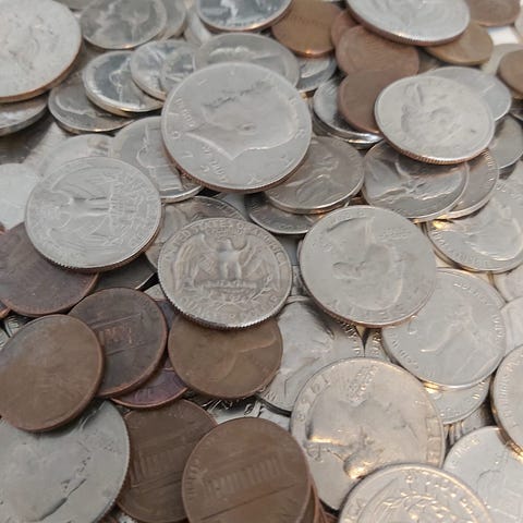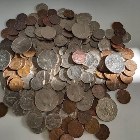 Kuva kolikot. USA one cent 1958 on uusin. Jotain hopea lantteja näkyy olevan joukossa.